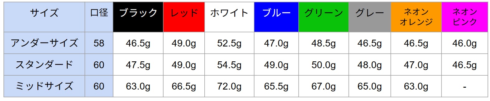 重量: 約45.0g 〜 52.5g(カラーにより異なります)