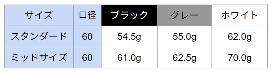 重量: ブラック 61.0g / グレー 62.5g / ホワイト 70.0g